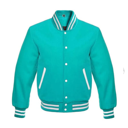 CYAN AND WHITE VARSITY JACKET WITH HOOD