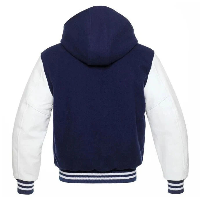 Stay stylish and cozy with this premium Hooded Varsity Jacket, featuring a classic combination of navy and white colors. Designed for comfort and durability, this jacket is perfect for any occasion.